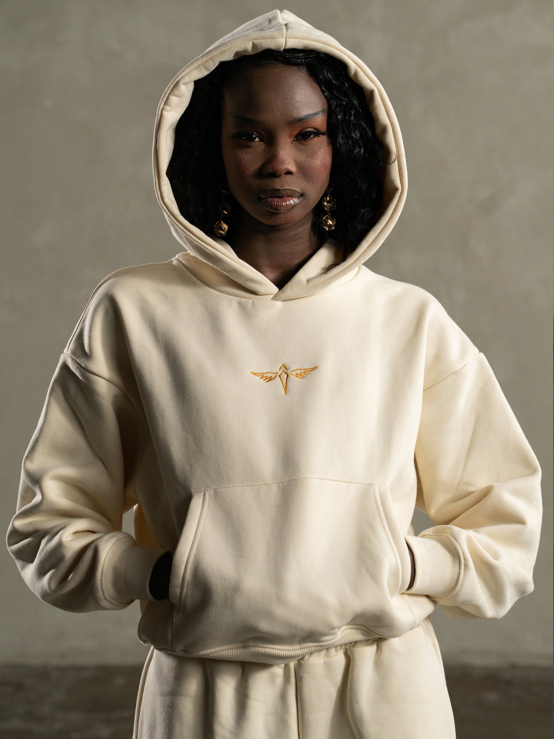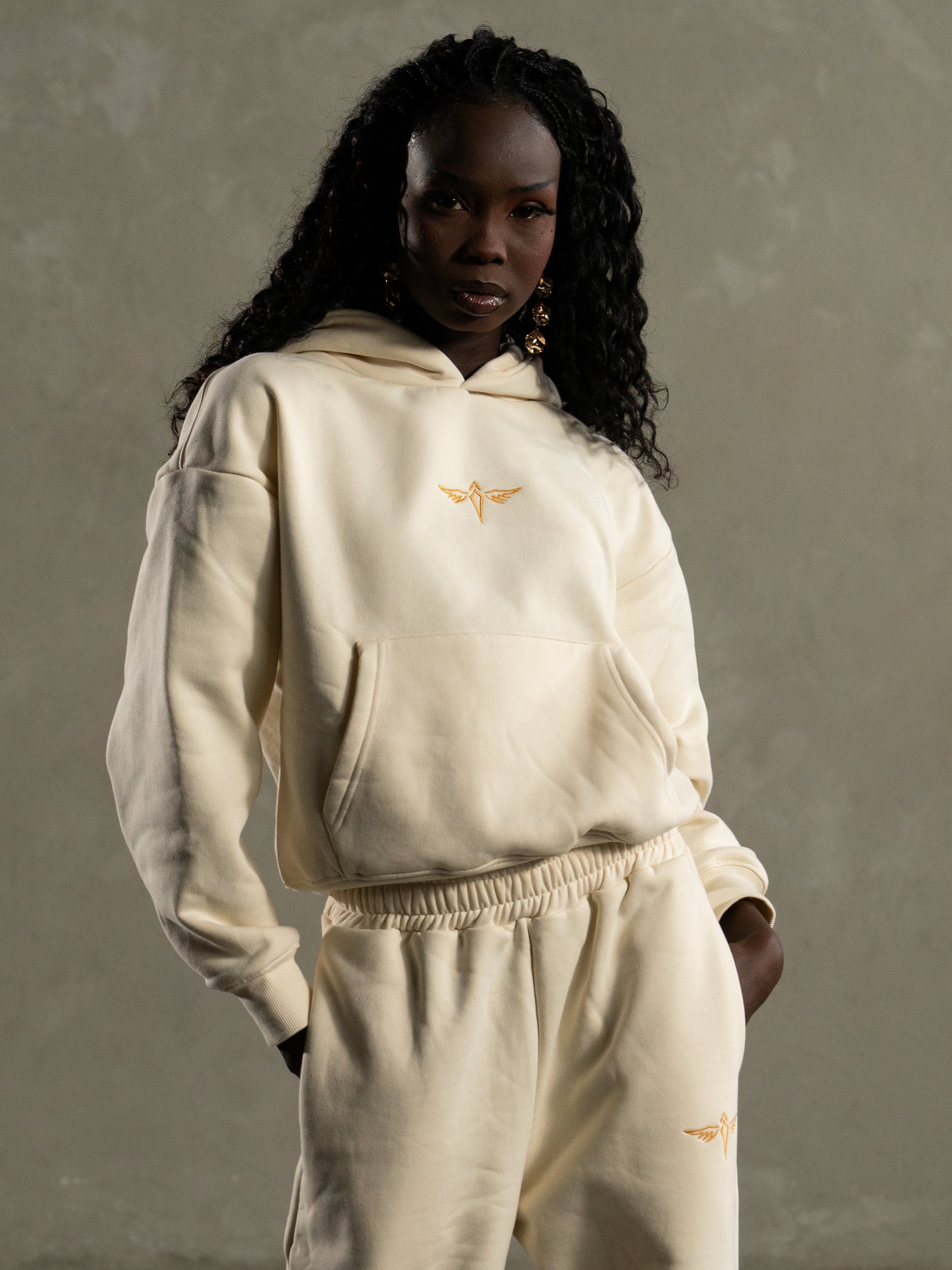 Our Cream Heavyweight Hoodie is a reimagined staple, crafted from a 750GSM premium poly-cotton blend and exclusively designed by our in-house team. With its cropped silhouette and oversized hood, this piece transforms classic loungewear into an effortlessly chic statement.